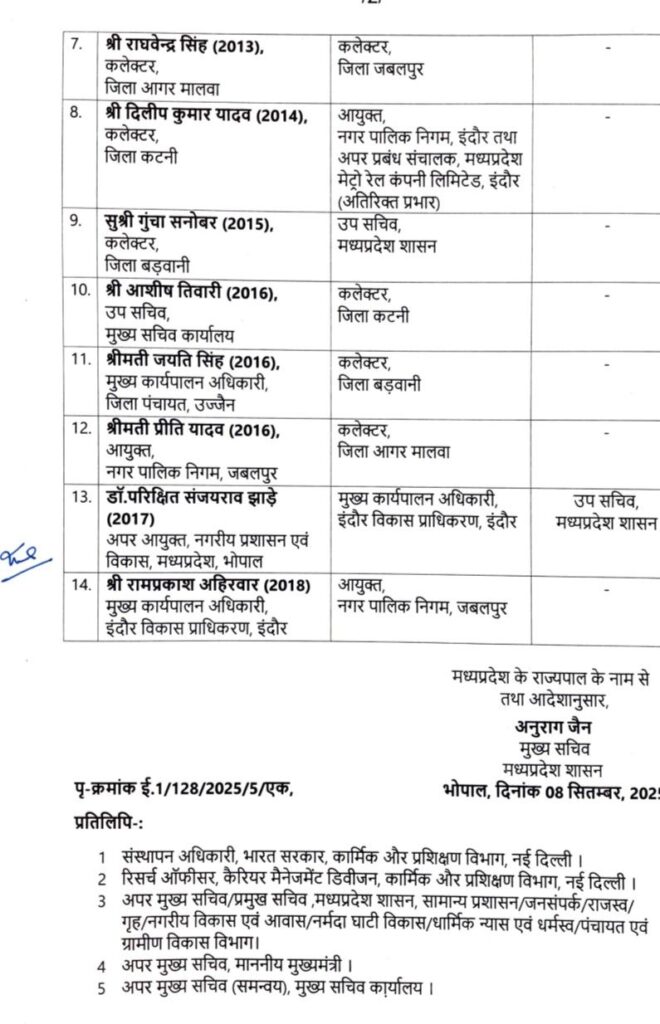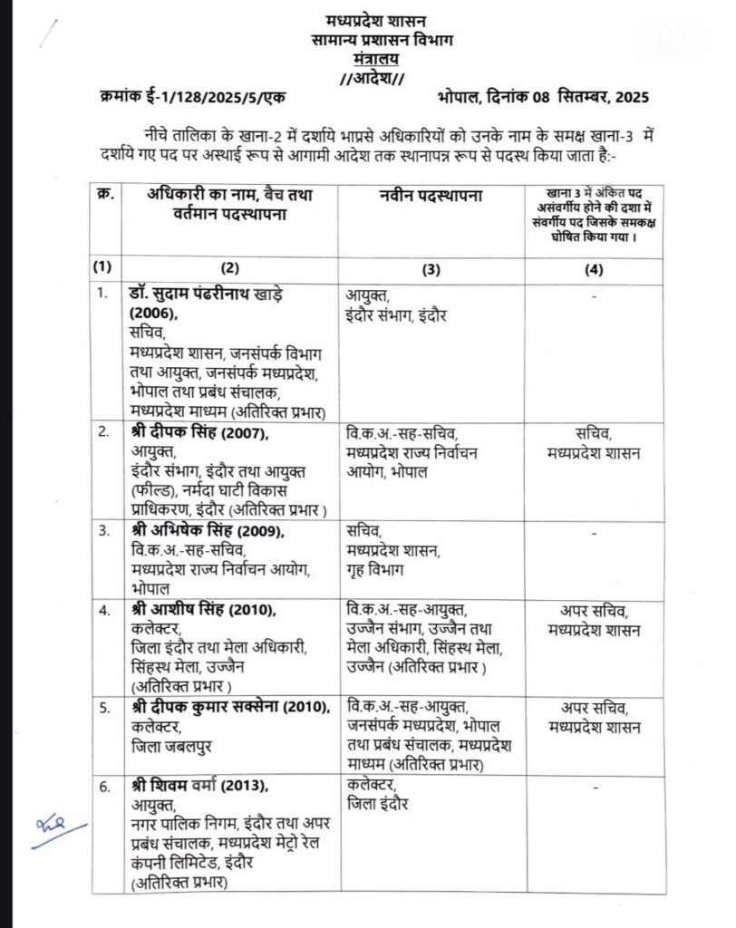 भोपाल। राज्य शासन ने सोमवार देर रात इंदौर जबलपुर सहित पांच जिलों के कलेक्टर बदल दिए हैं। मुख्य सचिव अनुराज जैन के सेवा विस्तार के बाद पहली बड़ी प्रशासनिक सर्जरी में 14 आईएएस अधिकारियों के तबादले किए गए हैं। इनमें जनसंपर्क आयुक्त को भी बदल दिया गया है। देर रात जारी आदेश के अनुसार जनसंपर्क आयुक्त सुदाम पढरी नाथ खाड़े को संभाग आयुक्त इंदौर संभाग इंदौर बनाया गया है, वहीं जबलपुर कलेक्टर दीपक कुमार सक्सेना को नया जनसंपर्क आयुक्त पदस्थ किया गया है।