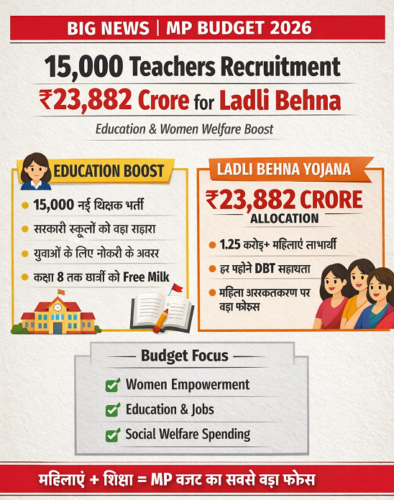 लाडली बहन के लिए 23,882 करोड़ का प्रावधान किया गया है। युवाओं के लिए 15,000 टीचरों की भर्ती का ऐलान किया गया है। आठवीं क्लास तक के बच्चों के लिए फ्री टेट्रा-पैक दूध का ऐलान किया गया है। राज्य में कोई नया टैक्स नहीं लगाया जाएगा।
