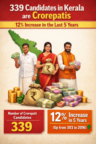तिरुवनंंतपुरम। केरल विधानसभा चुनाव 2026 के लिए एसोसिएशन फॉर डेमोक्रेटिक रिफॉर्म्स (ADR) और केरल इलेक्शन वॉच की रिपोर्ट के अनुसार, विश्लेषण किए गए 863 उम्मीदवारों में से 339 उम्मीदवार करोड़पति हैं। यह कुल उम्मीदवारों का लगभग 39% है।