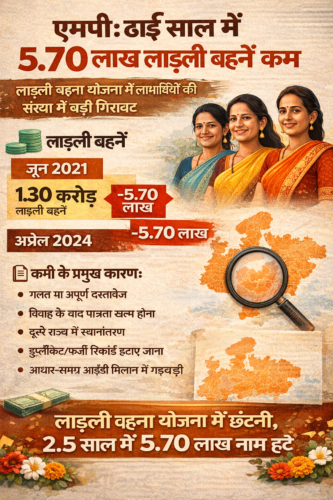 भोपाल। मध्य प्रदेश सरकार की महत्वाकांक्षी मुख्यमंत्री लाडली बहन योजना में पिछले करीब ढाई साल में 5.70 लाख से ज्यादा बहनों को बाहर कर दिया गया है। अब पात्र महिलाओं की संख्या घटकर 1 करोड़ 25 लाख 31 हजार रह गई है।