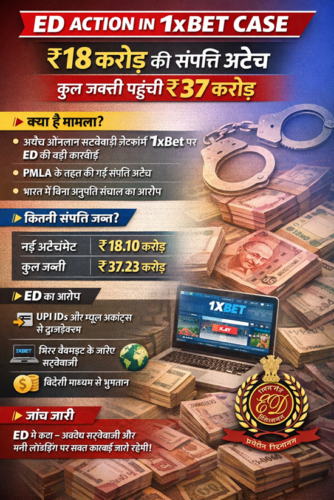 अवैध ऑनलाइन बेटिंग ऐप केस (विशेष रूप से 1xBet और महादेव ऐप) में प्रवर्तन निदेशालय (ED) और भारत सरकार द्वारा की गई बड़ी कार्रवाई की गई है।