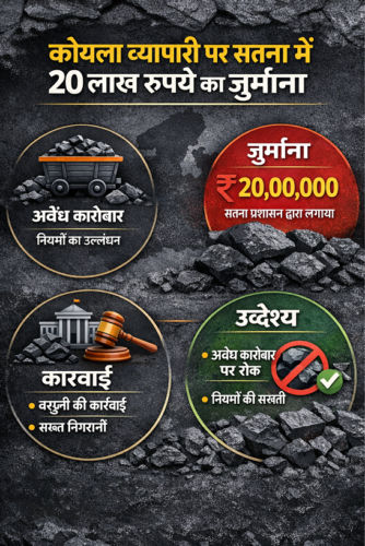 सतना। मध्य प्रदेश के सतना जिले में जिला खनिज अधिकारी ने एक कोयला व्यापारी पर गैर-कानूनी स्टोरेज के लिए 20 लाख रुपए का जुर्माना लगाया है। खनिज विभाग ने व्यापारी शुभम पांडे को गैर-कानूनी तरीके से कोयला स्टोर करने के लिए नोटिस जारी किया था। पांडे ने पैसे जमा कर दिए।
