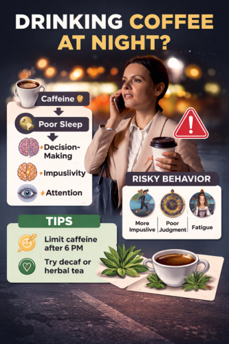 आवेगी व्यवहार में वृद्धि: ‘iScience’ जर्नल में प्रकाशित यूनिवर्सिटी ऑफ टेक्सास एट एल पासो (UTEP) के अध्ययन के अनुसार, रात में कैफीन का सेवन ‘इनहिबिटरी कंट्रोल’ (स्वयं पर नियंत्रण) को कम कर देता है, जिससे व्यक्ति बिना सोचे-समझे जोखिम लेने के लिए प्रेरित हो सकता है।