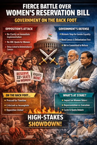 विवाद का कारण: विपक्ष ने इस बिल में परिसीमन (Delimitation) और जातिगत जनगणना के मुद्दों को लेकर कड़ा विरोध जताया।