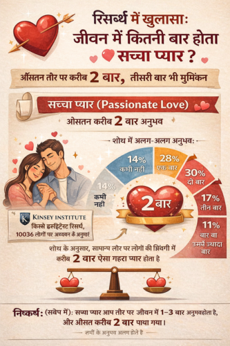 Thank you for reading this post, don't forget to subscribe!नई रिसर्च में प्यार को लेकर खुलासा हुआ है। किन्से इंस्टीट्यूट (Kinsey Institute) और अन्य अध्ययनों के अनुसार, एक इंसान को अपने जीवन में औसतन दो बार सच्चा और गहरा प्यार होता है। यह रिसर्च बताती है कि पहला प्यार अक्सर आदर्शवादी होता है, जबकि दूसरा प्यार इंसान को कमियों के बावजूद स्वीकार करने और समझदारी के साथ परिपक्व होता है।