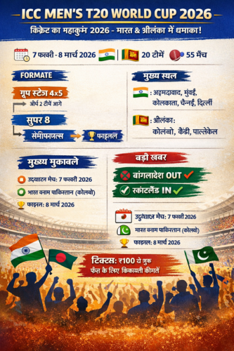 आईसीसी पुरुष T20 विश्व कप 2026 की सह-मेजबानी भारत और श्रीलंका करेंगे, जो 7 फरवरी से 8 मार्च 2026 तक चलेगा। टूर्नामेंट के लिए कुल 20 टीमों को चार ग्रुप में बांटा गया है। भारत अपने अभियान की शुरुआत 7 फरवरी को संयुक्त राज्य अमेरिका के खिलाफ करेगा, और पाकिस्तान के खिलाफ बहुप्रतीक्षित मुकाबला 15 फरवरी को कोलंबो में खेला जाएगा। हाल ही में, ICC ने बांग्लादेश को टूर्नामेंट से बाहर कर दिया है और स्कॉटलैंड को उनकी जगह शामिल किया है।