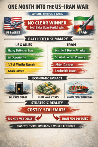 तेहरान/वॉशिंगटन। 28 मार्च 2026। अमेरिका-इजरायल और ईरान के बीच छिड़े युद्ध को लगभग एक महीना (29 दिन) पूरा हो चुका है। वर्तमान में कोई भी पक्ष स्पष्ट रूप से “विजेता” नहीं बना है, और युद्ध एक खतरनाक गतिरोध (Stalemate) की स्थिति में है।