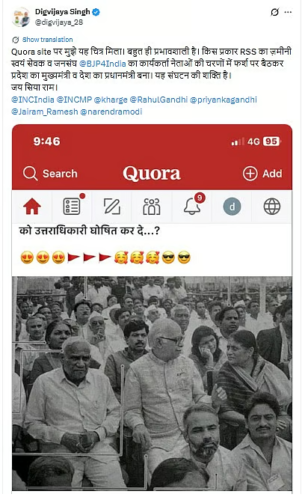 सिंह ने कहा, मुझे यह तस्वीर Quora साइट पर मिली। यह बहुत प्रभावशाली है। किस तरह से आरएसएस के जमीनी स्तर के स्वयंसेवक और जनसंघ के कार्यकर्ता @भाजपा4इंडिया नेताओं के चरणों में जमीन पर बैठकर राज्य के मुख्यमंत्री और देश के प्रधान मंत्री बन गए।