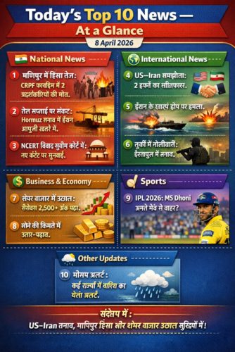 आज 8 अप्रैल 2026 की मुख्य खबरें अंतरराष्ट्रीय तनाव में कमी, मौसम के बदलते मिजाज और खेल जगत के रोमांच के इर्द-गिर्द घूम रही हैं।