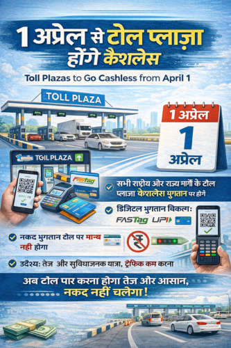 1 अप्रैल 2026 से, सरकार ने टोल प्लाजा पर नकद भुगतान पर पूरी तरह रोक लगाने का फैसला किया है; केवल FASTag या UPI भुगतान ही मान्य होंगे।