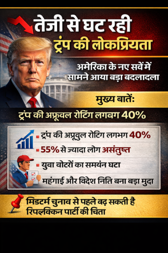 घटती लोकप्रियता: ईरान के साथ युद्ध की संभावनाओं के कारण ट्रंप की अप्रूवल रेटिंग गिर रही है और उनके समर्थक भी विरोध में उतर आए हैं। मार्च 2026 के एक सर्वे के अनुसार, 57% मतदाता उनके प्रदर्शन से नाखुश हैं।
